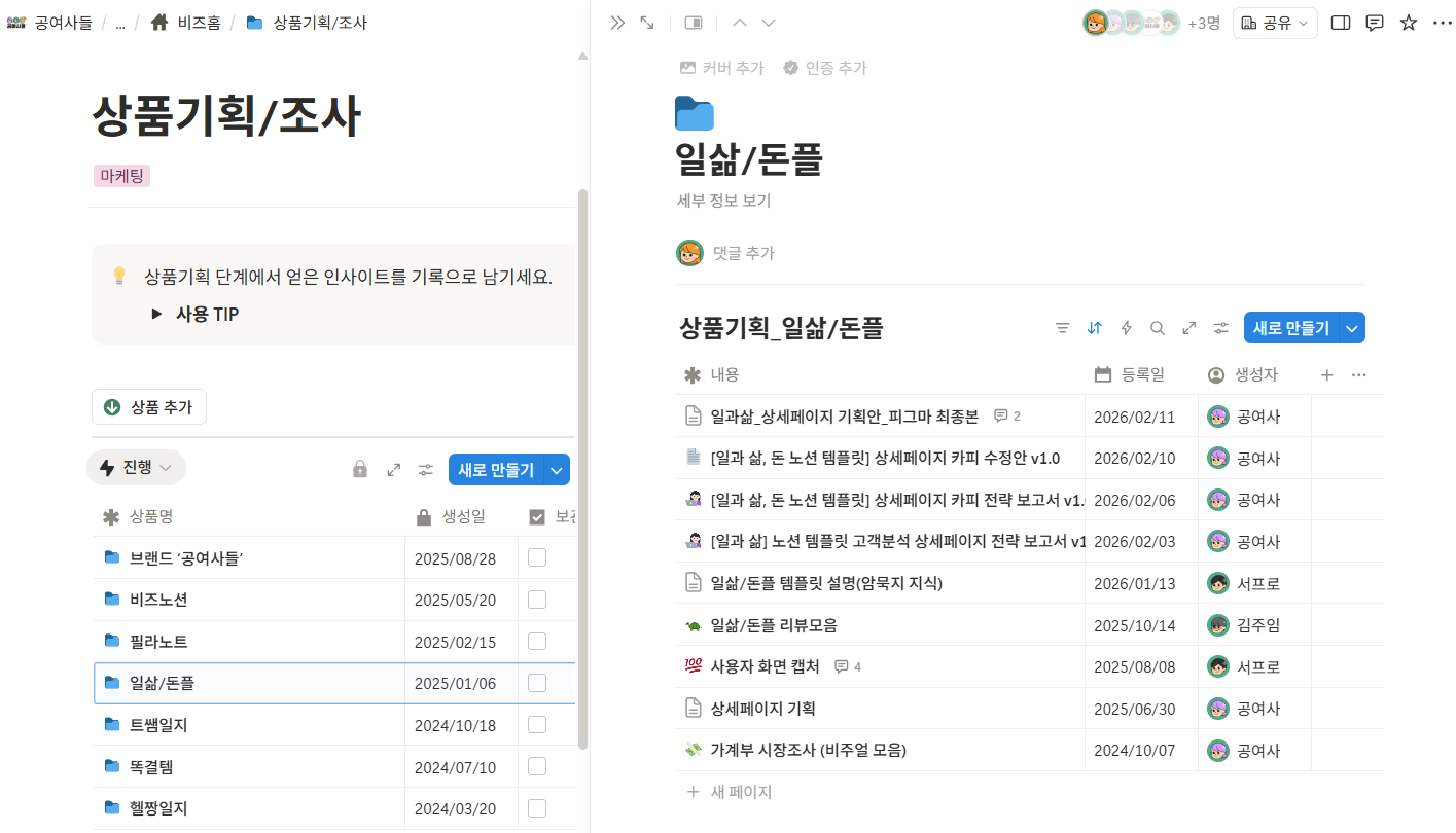런칭할 때만 열심히 다듬고 이후엔 방치했던 상품 자료가, 이제는 프로모션 시즌마다 꺼내서 다시 쓸 수 있는 자산이 됐어요. 새 인원이 합류할 때도 해당 페이지에 초대만 하면 되고요. 협업에 드는 리소스도 줄고, 자료 관리 부담도 함께 줄었어요.