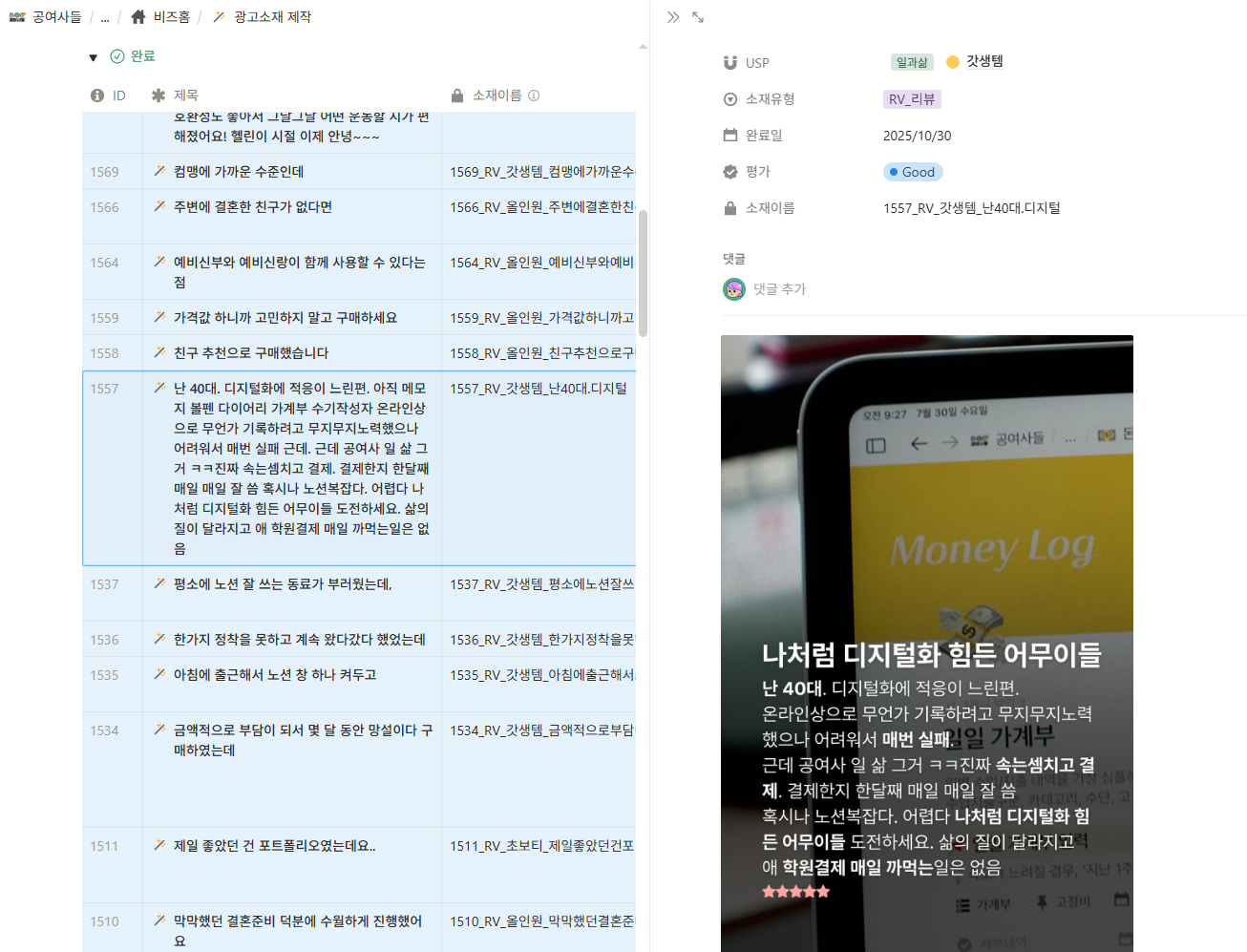 시스템을 도입하고 나서 가장 먼저 달라진 건, 이미 갖고 있던 것들을 보는 눈이었어요. 고객 리뷰, 상품 기획안, 예전 광고 이미지 — 그동안 그냥 쌓아만 두고 꺼내지 못했던 것들이 실제로 쓸 수 있다는 걸 알게 된 거예요. 새로 뭔가를 만들지 않아도, 지금 있는 것들로 시작할 수 있다는 감각이 생긴 거예요.