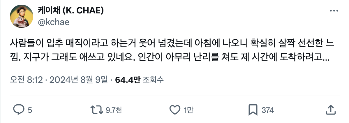 지난 7일 가을의 시작을 알리는 절기 ‘입추’가 지나며 아침 저녁으로 기온이 선선해지자 사람들 사이에서 ‘입추매직’이라는 단어가 유행하고 있어요. 입추가 지나면 뜨거웠던 무더위가 마법처럼 시원해진다는 뜻의 단어인데요. 곧 있을 처서도 ‘처서매직’을 기다리는 사람들이 많다고. 🔗 점점 뜨거워지는 여름, 앞으로 말차 못 먹게 될 수도 있다고? 😱🍵