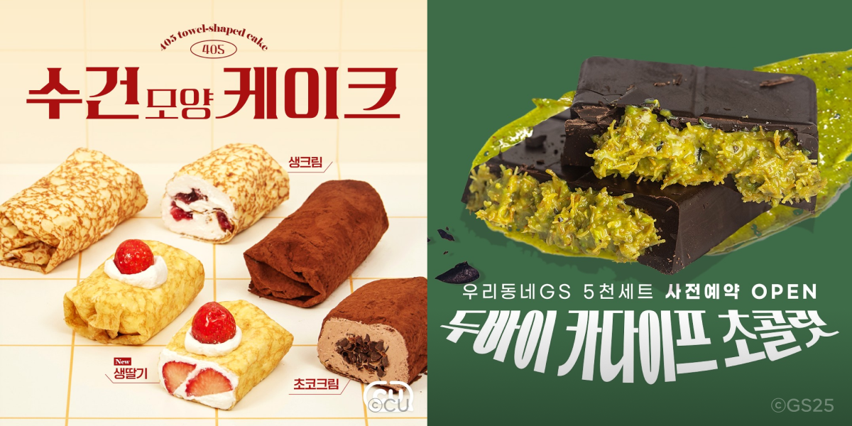 편의점의 ‘시즌 신제품’ 전략은 제철 식재료를 넘어서, 그때그때 유행하는 아이템·키워드를 활용하는 데에도 적용돼요. ‘두바이 초콜릿’·‘수건 케이크’·‘스웨디시 젤리’처럼 SNS에서 유행했던 아이템들을 공식 제품으로 내놓는 게 대표적인데요. 지난해 틱톡과 인스타그램에서 두바이 초콜릿이 유행하기 시작하자 CU·GS25 등은 앞다퉈 피스타치오와 카다이프를 넣은 두바이 스타일 초콜릿 신제품을 만들어 내놨어요. 같은 해 하반기에는 넷플릭스 예능 ‘흑백요리사’에 등장한 ‘밤 티라미수’ 레시피가 인기를 끌자, CU에서 공식 콜라보 제품을 내놓으며 화제가 되기도 했고요.