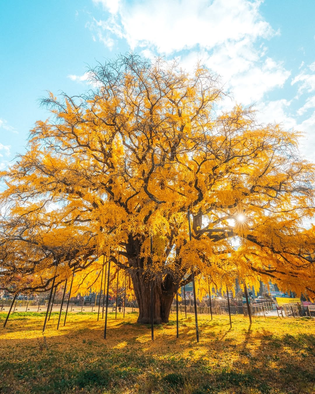 저는 여러 단풍나무 중 은행나무를 제일 좋아하는데요. 저처럼 은행나무를 좋아하는 뉴니커라면 꼭 인천대공원에 방문해 봐요. 인천대공원 뒤편에 자리 잡고 있는 인천 장수동 은행나무를 만날 수 있거든요. 장수동 은행나무의 수령은 약 800년으로 추정되는데요. 역사와 크기를 인정받아 우리나라의 천연기념물로 지정되기도 했어요. 최근엔 SNS에서도 은행나무 명소로 바이럴되고 있다고.