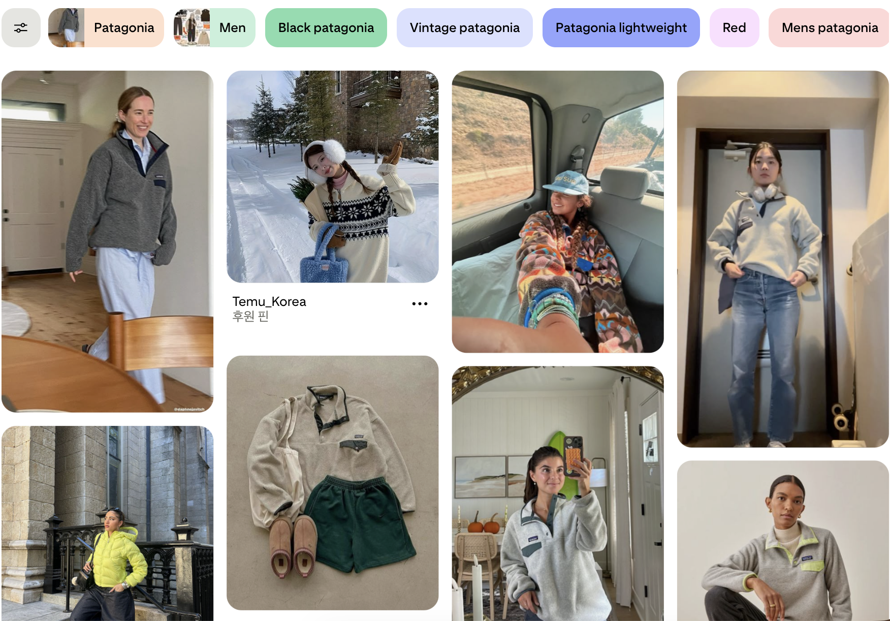 파타고니아의 ‘신칠라(synchilla)’ 플리스 제품이 틱톡・핀터레스트 등에서 유행하고 있어요. 패딩 안에 껴입을 수 있는 적당한 두께와 디자인 + 매년 달라지는 유니크한 색 조합으로 패션에 관심이 많은 사람들 사이에서 인기를 얻고 있는 것. 요즘 유행하는 ‘그래놀라 걸 코어’의 영향 때문이라는 분석도 있다고.