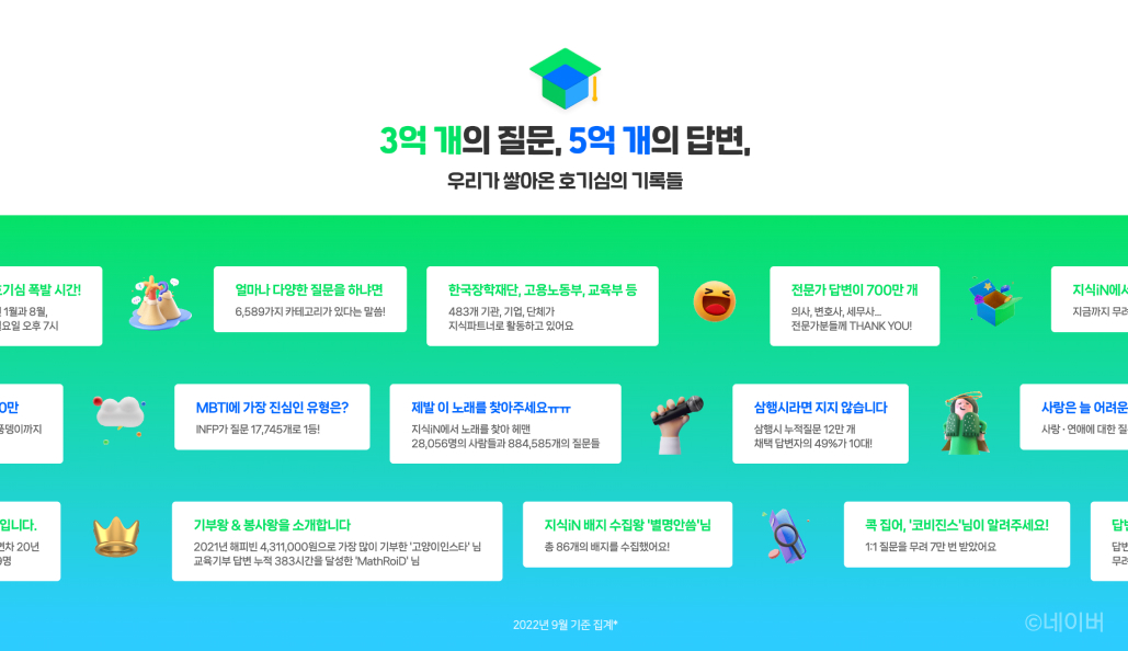이렇게 시작된 지식iN은 빠르게 네이버의 핵심이 됐어요. 런칭 1년 만에 네이버를 검색엔진 1위로 만들어줬고, 지난 20년간 누적 사용자 3,200만 명을 기록했죠. 미디어 환경이 바뀌고 AI까지 등장했지만, 지식iN은 여전히 질문을 매개로 경험과 지혜를 나누는 커뮤니티라는 고유한 매력을 간직하고 있어요. 이번 사건에서 사람들이 감동한 것도, 지식iN이 20년 넘게 쌓아온 연결의 감각이 살아 있었기 때문이에요. AI가 자리 잡은 지금도 지식iN 질문자 중 10~30대의 비율은 80%에 달할 정도죠.