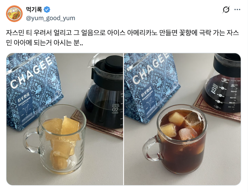 자스민 차를 우려서 얼음으로 얼린 뒤, 그 위에 아메리카노를 부어 만드는 ‘자스민 아메리카노’ 레시피가 X에서 유행 중이에요. 꼭 자스민이 아니더라도 평소 좋아하던 차의 티백을 사용해 만들 수 있어서 인기가 많은데요. 커피에 향긋한 매력이 더해진 맛이라, 평범한 아메리카노에 질렸다면 시도해 봐도 좋을 것 같아요.