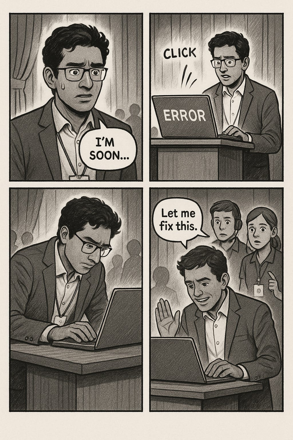 곧 수백 명의 청중 앞에서 회사를 소개해야 하는 긴장된 순간이었다.