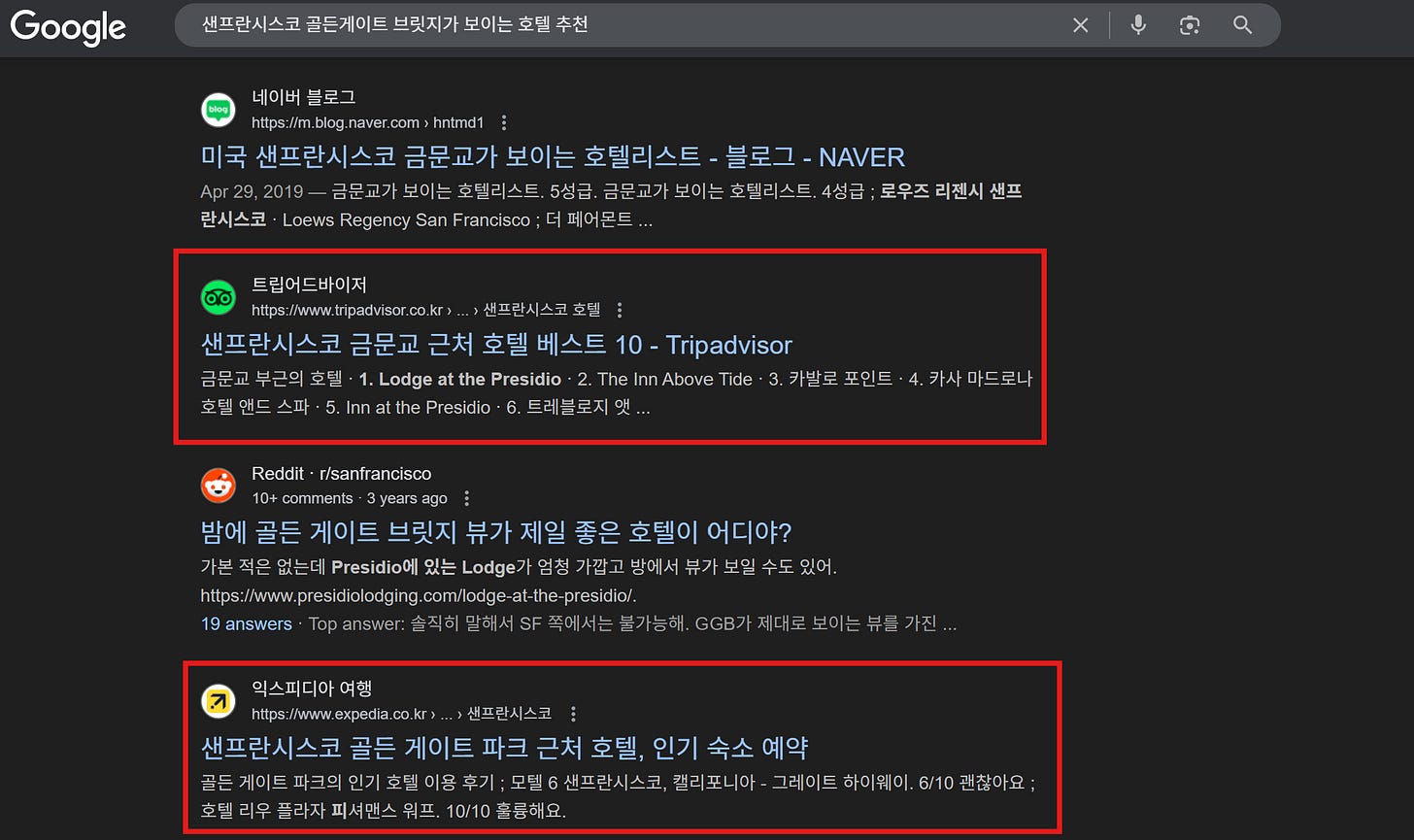 사용자가 “샌프란시스코에서 골든게이트 브릿지가 보이는 호텔을 추천해 달라”라고