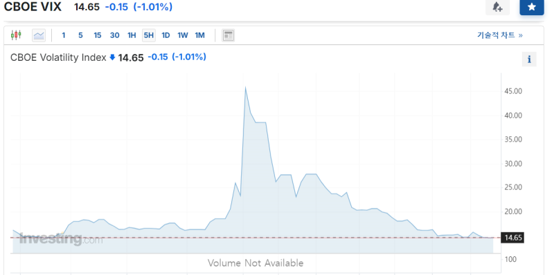 변동성을 알아볼 수 있는 CBOE의 VIX 지수 또한 현재 14.65를 기록하며 불확실성과 공포감이 크게 줄었음을 파악할 수 있다.