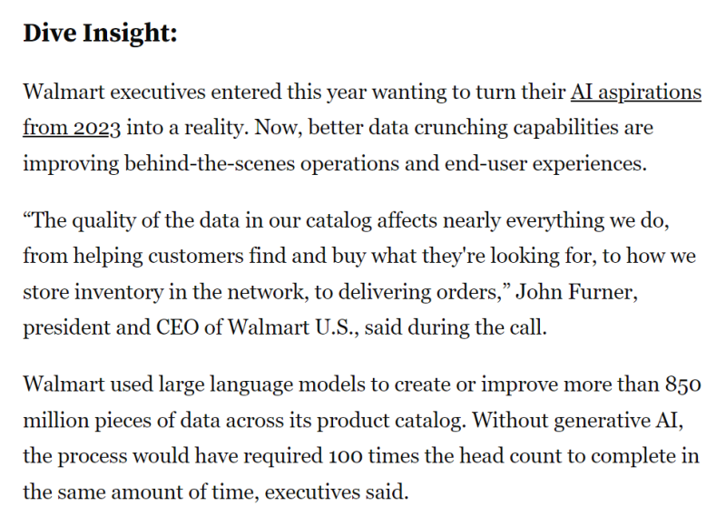추가로 월마트는 데이터를 활용한 AI 기반 검색 기능을 도입했다고 전했다. Walmart의 사업 전반에 긍정적인 영향을 줬으며, 임원들은 'AI가 없었다면 100배 더 많은 인력이 필요했을 것' 이라며 AI의 능력에 찬사를 보냈다.