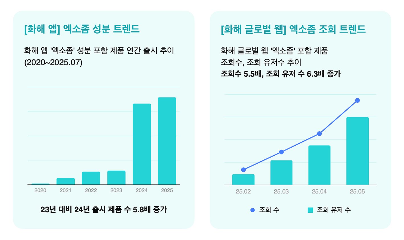 2025년 상반기 화해 글로벌 웹 데이터 분석 시, '엑소좀'을 포함한 제품의 조회 수가 2월 대비 5월 5.5배, 조회 유저 수는 6.3배로 급증했습니다. 이러한 변화는 국내뿐만 아니라 글로벌 시장 전반에서 엑소좀 성분에 대한 소비자들의 관심이 폭발적으로 커지고 있음을 보여줍니다. K-뷰티를 비롯한 글로벌 브랜드들이 세럼, 앰플, 크림 등 다양한 제형으로 제품 라인업을 확대하면서, 엑소좀은 단순한 원료를 넘어 차세대 핵심 기능성 트렌드로 자리 잡아가고 있습니다.