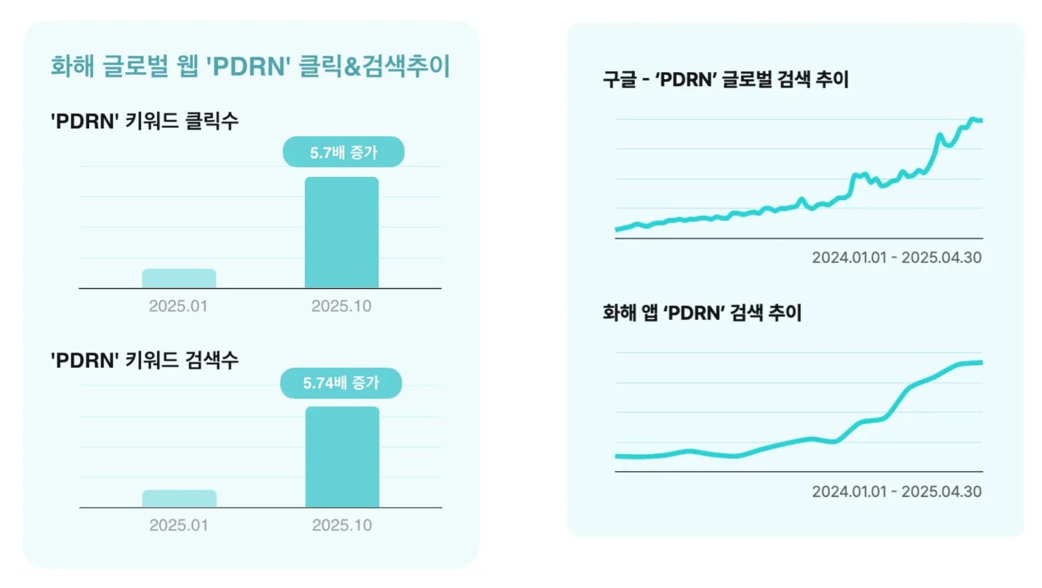 2025년 1월 대비 2025년 10월, 화해 글로벌 웹 내 ‘PDRN’ 키워드 클릭 수는 5.7배, 검색 수는 5.74배까지 증가했습니다. 이는 단순히 노출이 늘어난 수준을 넘어 사용자가 직접 ‘PDRN’을 찾아보고 관련 제품에 들어가 보는 소비자 행동을 통해 PDRN이 일부 마니아만 아는 성분이 아니라, 일반 소비자들이 이름을 알고 찾아보는 메이저 성분으로 올라섰다는 신호로 볼 수 있습니다.