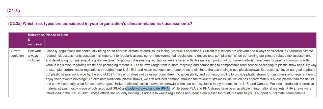 현재 새롭게 개발된 'PBAT' 소재는 상온 일반 토양에서 2년 이내 90% 이상 분해가 가능하다는 것도 보고가 됐습니다.(BADP코리아) 또한, 미국 스타벅스는 기후변화 공개자료에서 'PLA'와 'PHA'를 도입했다는 말을 하기도 하죠.