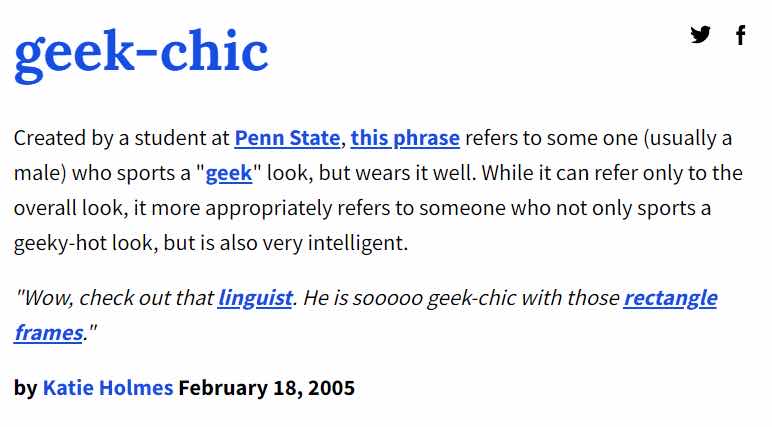현대에는 아이웨어를 포인트로 발전이 됐고 꾸미지 않았는데 멋있어야 하는 의도를 갖고 있습니다. 사회학자들은 다시금 긱시크가 유행하는 것에 대해 미적 기준보다 차별화를 얘기했습니다.