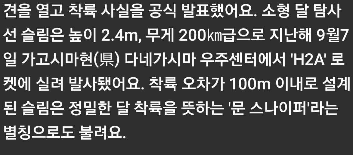 달 착륙 성공이 확인된 이후 JAXA는 2시10분 기자회견을 열고 착륙 사실을 공식 발표했어요. 소형 달 탐사선 슬림은 높이 2.3m, 무게 700kg(추진체 제외 시 340kg)으로 지난해 9월7일 가고시마현(県) 다네가시마 우주센터에서 'H2A' 로켓에 실려 발사됐어요. 착륙 오차가 100m 이내로 설계된 슬림은 정밀한 달 착륙을 뜻하는 '문 스나이퍼'라는 별칭으로도 불려요.