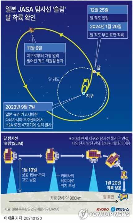 일본 우주항공연구개발기구(JAXA)에 따르면 일본의 달 탐사선 ‘슬림(SLIM)’이 오늘(20일) 0시쯤 고도 약 15㎞ 부근에서 달 앞면 적도 인근의 크레이터 근처를 향해 하강하기 시작해 0시 20분, 달 표면에 도달했어요. 이로써 일본은 옛 소련·미국·중국·인도에 이어 세계에서 다섯 번째로 달 착륙에 성공한 나라가 됐는데요.