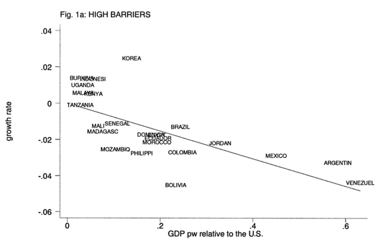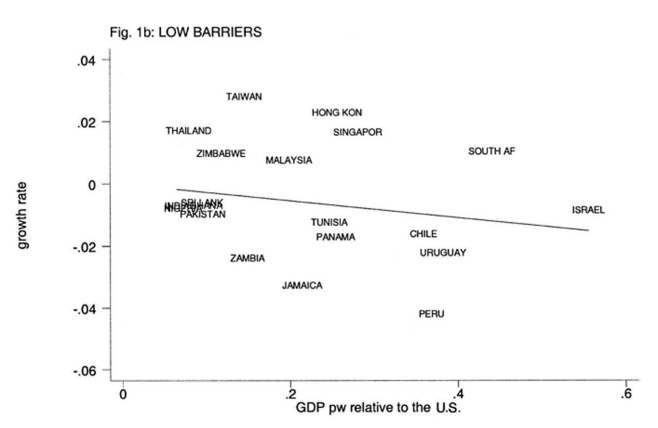 x์ถ์ ๋ฏธ๊ตญ ๋๋น GDP๋ก ๊ฒฝ์ ์ ๊ท๋ชจ๋ฅผ ์๋ฏธํด์. y์ถ์ ์ฑ์ฅ๋ฅ ์ ์๋ฏธํ์ฃ . x๊ฐ์ด ์ปค์ง์๋ก(๊ฒฝ์ ๊ท๋ชจ๊ฐ ์ปค์ง์๋ก) y๊ฐ์ ์์์ง๋๋ฐ(์ฑ์ฅ๋ฅ ์ ์์์ง๋๋ฐ), ๊ฐ๋ง ๋ณด๋ ์ผ์ชฝ ์์ ์ง์ ์ฅ๋ฒฝ์ด ๋์ ๊ตญ๊ฐ(HIGH BARRIERS)๋ผ๊ณ ์ ํ์๋ค์. ์ํ! ์ด ๊ทธ๋ํ๋ ์ง์ ์ฅ๋ฒฝ์ด ๋์ ์ฐฝ์กฐ์ ํ๊ดด๊ฐ ๋งํ ์ค๋๋๊ณ ์์ฐ์ฑ์ด ๋ฎ์ ๊ธฐ์ ๋ค์ด ๋ฒํฐ๋ ๊ตญ๊ฐ๋ค๋ก ๊ตฌ์ฑ๋์ด ์์ด์. ๊ธฐ์ธ๊ธฐ๋ฅผ ๋์ ๋ด์๋์ธ์. (๊ทธ๋์ ๋ ์ฐ๋ฆฌ๋๋ผ๊ฐ ํ๊ฐ์ ๊ธฐ์ ์ด๋ผ๊ณ ๋ถ๋ฆฐ ๋ฐ๋ ๊ทธ๋งํ ์ด์ ๊ฐ ์๊ตฐ์. ์๋์ค๋ฝ์ต๋๋ค!)