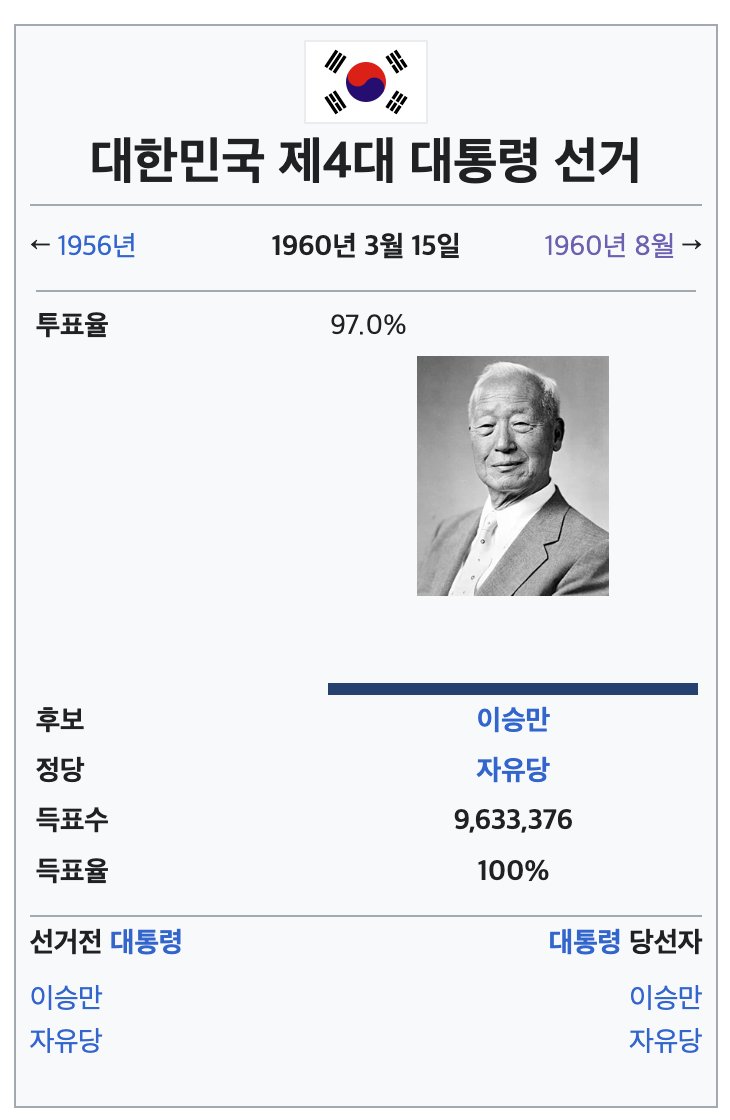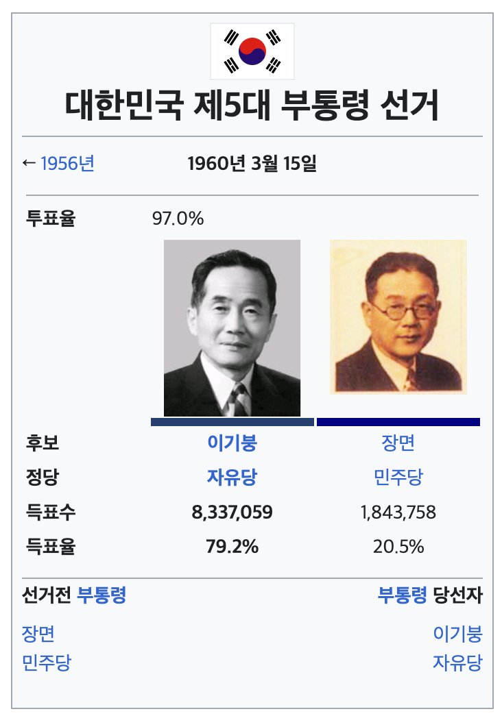 1960년 3월 15일에 치러진 4대 대선 및 5대 부선은 4할 사전투표, 대리투표, 민주당 참관인 방해 등 다양한 부정행위를 동반했어요. 선거 결과 이승만은 단독 후보로 대통령에, 이기붕은 득표율 79%로 부통령에 당선됐죠.