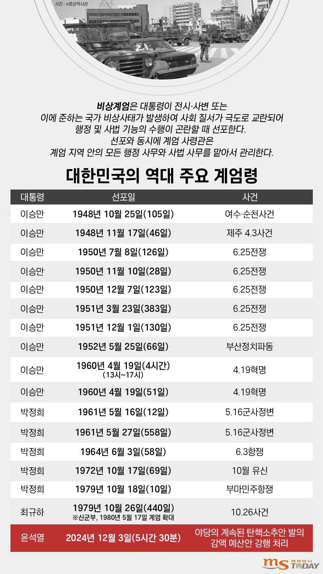 서울 지역에 선포된 경비계엄. 그렇다면 이것으로 시위의 열기가 잡혔을까요? 오히려 부산, 대구, 광주, 대전 등 전국 곳곳으로 퍼져나갔어요. 이를 막기 위해 4시 30분쯤 해당 지역에도 경비계엄을 추가로 선포했고, 그래도 잡히지 않자 오후 5시부터는 비상계엄으로 변경했어요. 이미 잘 아시겠지만 비상계엄은 군이 직접 치안, 행정, 사법을 장악할 수 있는 가장 강력한 형태의 계엄이에요. 대표적으로는, 군사법원이 민간인을 재판할 수 있고, 국회의 활동 제한도 가능하고, 언론·출판·집회·통신의 전면적인 통제가 가능해요. 군이 국가 통치의 주체가 되는 완전한 비상통치 체제죠. (맨 첫 번째 사진에 보면, 4월 19일 당일에 두 번의 계엄이 선포됐다고 나오는데 경비계엄, 그리고 비상계엄 이렇게 두 종류의 계엄이 나왔기 때문이에요.)
