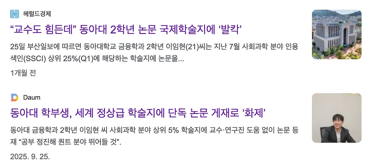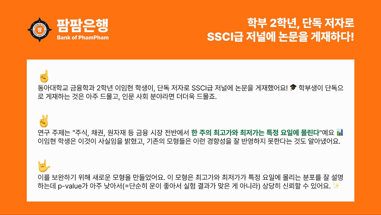 학부생이 교수 등 전문가의 도움 없이 단독 저자로 짱짱한 국제저널 논문을 게재하는 것은 극히 드문 일이에요. (이공계 분야에서는 가끔 있지만 인문 사회 분야에서는 아주 희귀하고, 특히 단독 저자라면 더더욱 그렇죠!) 이와 유사한 사례는 10년 전으로 거슬러 올라가 2015년에나 있었어요. 부산대 경영학과 조인재, 김유진 학생이 품질 경영에 관한 분야로 🔎 SSCI 국제 저널에 논문 발표를 성공했죠. (이들은 교수의 지도를 받아 함께 연구했어요.)