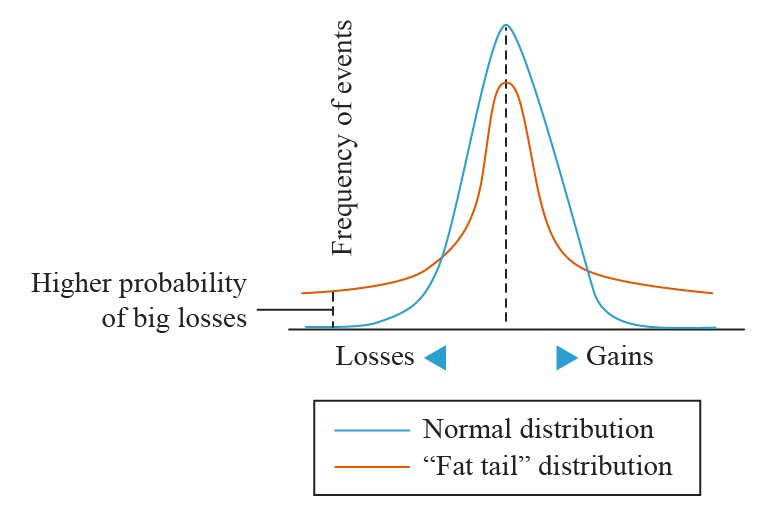 미국의 금융공학자 스티븐 헤스톤은 "GBM 모형은 변동성을 포함하고 있지만, 변동성이 일정한 것이 문제야!"라고 말했어요. 우리 모두 주식에서 희로애락을 느끼면서 경험해 봤겠지만, 어떤 시기에는 변동성이 작아서 위아래로 작게 흔들리고, 어떨 때는 변동성이 커서 크게 흔들리는데 이런 현상을 GBM은 제대로 설명하지 못한다고 말한 것이죠. 그래서 1993년 논문에서 Heston 모형을 만들었어요. 변동성 자체도 변동성을 가지고 있다는 아이디어를 포함한 모형이죠. 이 덕분에 Heston 모형이 아주 잘 설명할 수 있는 현상은 바로 "두꺼운 꼬리(fat tail)" 현상이에요. 아래 그래프를 볼까요?