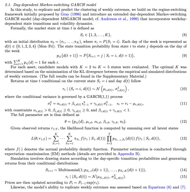 이임현 학생은 여기서 그치지 않아요. 이를 포함할 수 있는 새로운 모형을 제안하죠. 이름하여 바로 "Day-Dependent Markov-Switching GARCH Model" 자세한 사항은,,,