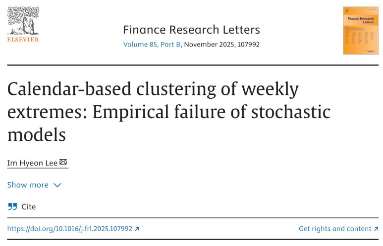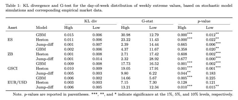 그럼 다시 p-value 열을 볼까요? 저자가 검증하고 싶었던 가설은 "무작위로 가격을 생성하는 기존의 모형들이 만들어낸 주간 극단값의 요일별 분포가 실제 시장에서 관측된 주간 극단값의 요일별 분포와 다르다"예요. 최고가(High), 최저가(Low) 두 부분으로 쪼개서 봤는데 어떤가요? 대부분의 항목에서 p-value는 0.05보다 낮고, 몇몇은 심지어 0.01보다 낮아요(우연으로 이런 결과가 나왔을 확률이 1% 미만이라는 뜻!). 그러니까 저자의 가설이 옳았던 것이죠. 기존의 모형은 특정 요일에 최고가, 최저가가 몰리는 것을 설명하지 못해요!