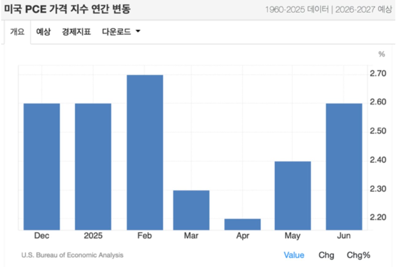 이러한 PCE 물가지수가 2025년 4월을 기점으로 다시 반등하기 시작했고, 6월 기준 전년 동월 대비 2.6% 상승하며 최근 4개월 내 가장 높은 수준을 기록했습니다.