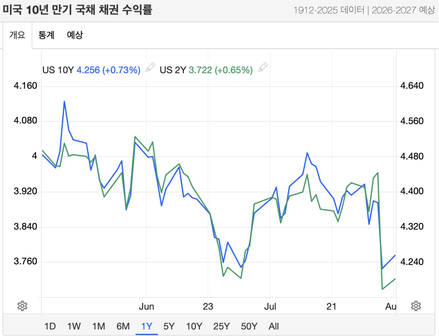 이번 7월 고용지표 발표 이후, 미국 국채 금리가 급락했습니다.