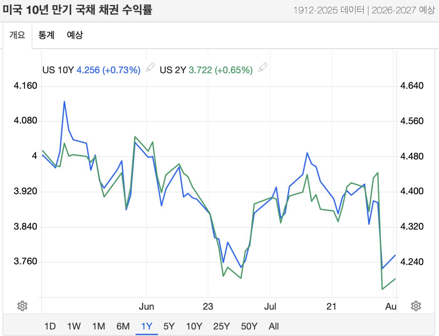 이날 미국채 2년물 금리는 3.96%에서 3.70%로, 10년물은 4.38%에서 4.23%로 하락했습니다. 단기·장기 채권 금리가 동시에 급격하게 떨어졌다는 건, 시장이 금리 인하 가능성을 선반영했다는 신호였습니다.(채권 금리와 금리 인하 가능성 관계가 궁금하다면, 여기를 눌러 구독하고 해당 내용을 확인해보세요!)
