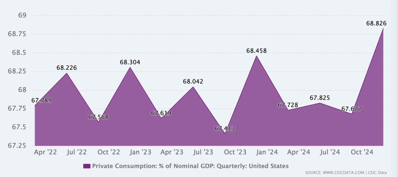 미국은 소비 중심으로 경제 성장을 합니다. 2024년 12월 기준으로 미국의 개인 소비는 GDP의 약 70%를 차지할만큼 높죠. 이를 바꿔말하면, 미국의 경제 성장은 각 경제 주체들의 소비가 좌우한다라고 볼 수 있습니다.