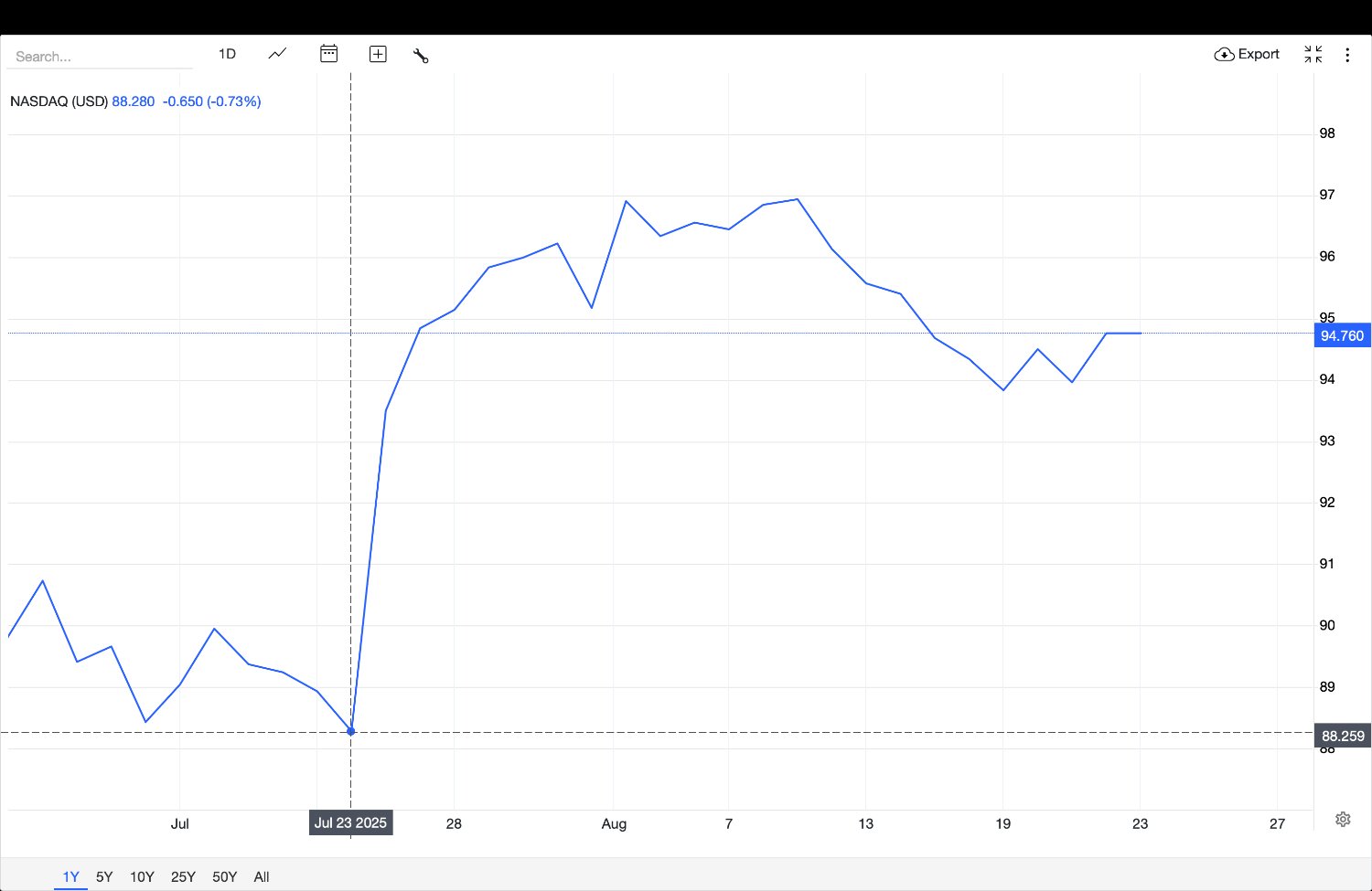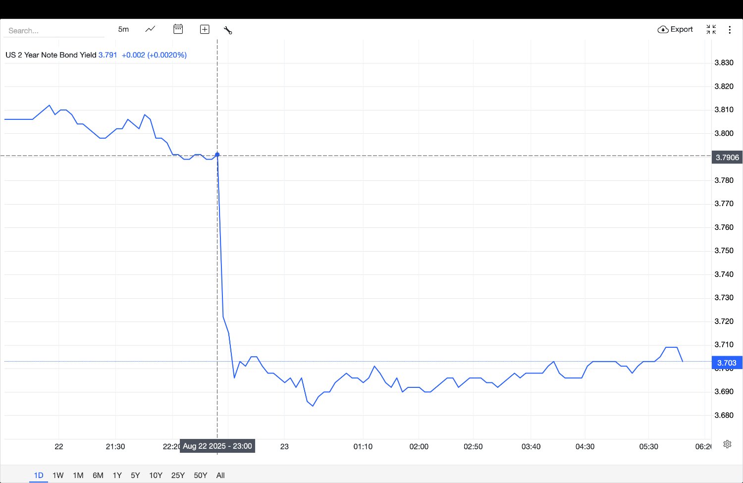 이번 연설은 가상화폐 뿐 아니라 미국 증시와 채권시장에도 강한 파급력을 미쳤습니다. 특히 기준금리에 가장 민감하게 반응하는 미국채 2년물 금리가 최대 0.29% 하락했다는 점(23일 06시 기준)은, 시장이 이번 연설을 통해 금리 인하 가능성이 한층 높아졌다고 받아들였음을 보여줍니다.