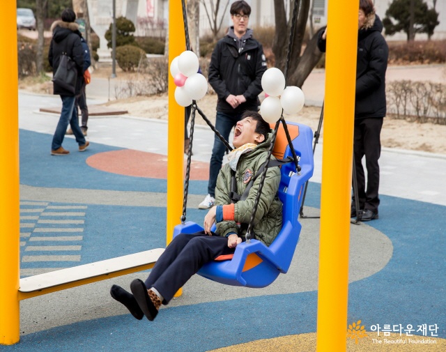 2. 안전벨트 그네, 바구니형 그네: 신체 정렬이 어려운 장애 아동뿐만 아니라 비장애 아동도 더욱 안전하게 그네를 탈 수 있습니다. 친구와 함께 그네를 타며 사회성을 기를 수도 있습니다.