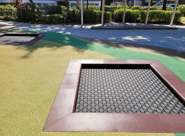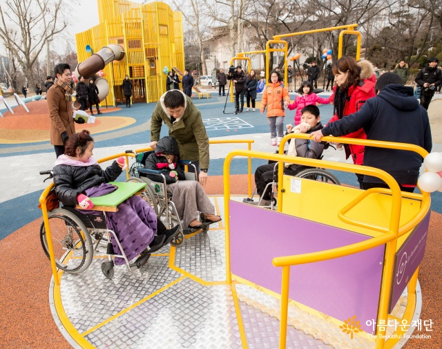 1. 턱이 없는 회전 놀이기구: 턱이 없어서 휠체어를 타고도 쉽게 들어갈 수 있고, 휠체어를 고정할 수도 있습니다. 바닥재도 덜 미끄러지는 특수 소재를 사용했습니다.