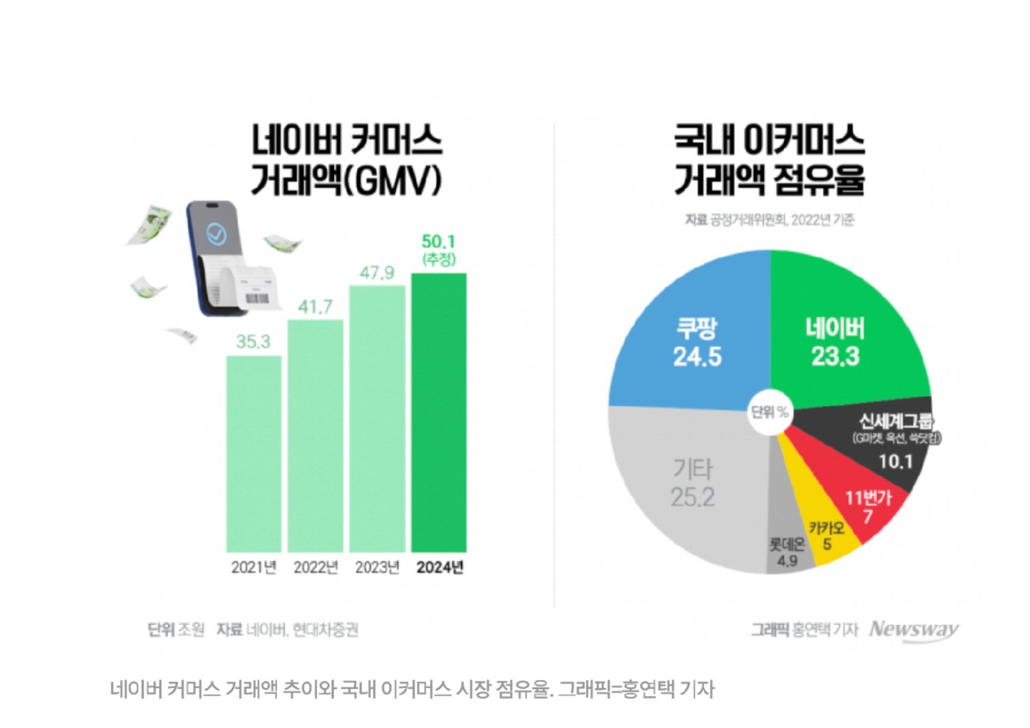 국내 이커머스 시장 점유율을 살펴보면, 네이버 커머스의 거래액은 계속 증가하고 있습니다. 아마 자고 일어나면 더 증가해 있겠죠. 그만큼 사람들의 수요가 뒷받침되어 주고 있고 실질적으로 쿠팡 다음으로 국내에서 가장 큰 오픈마켓이 되었습니다.