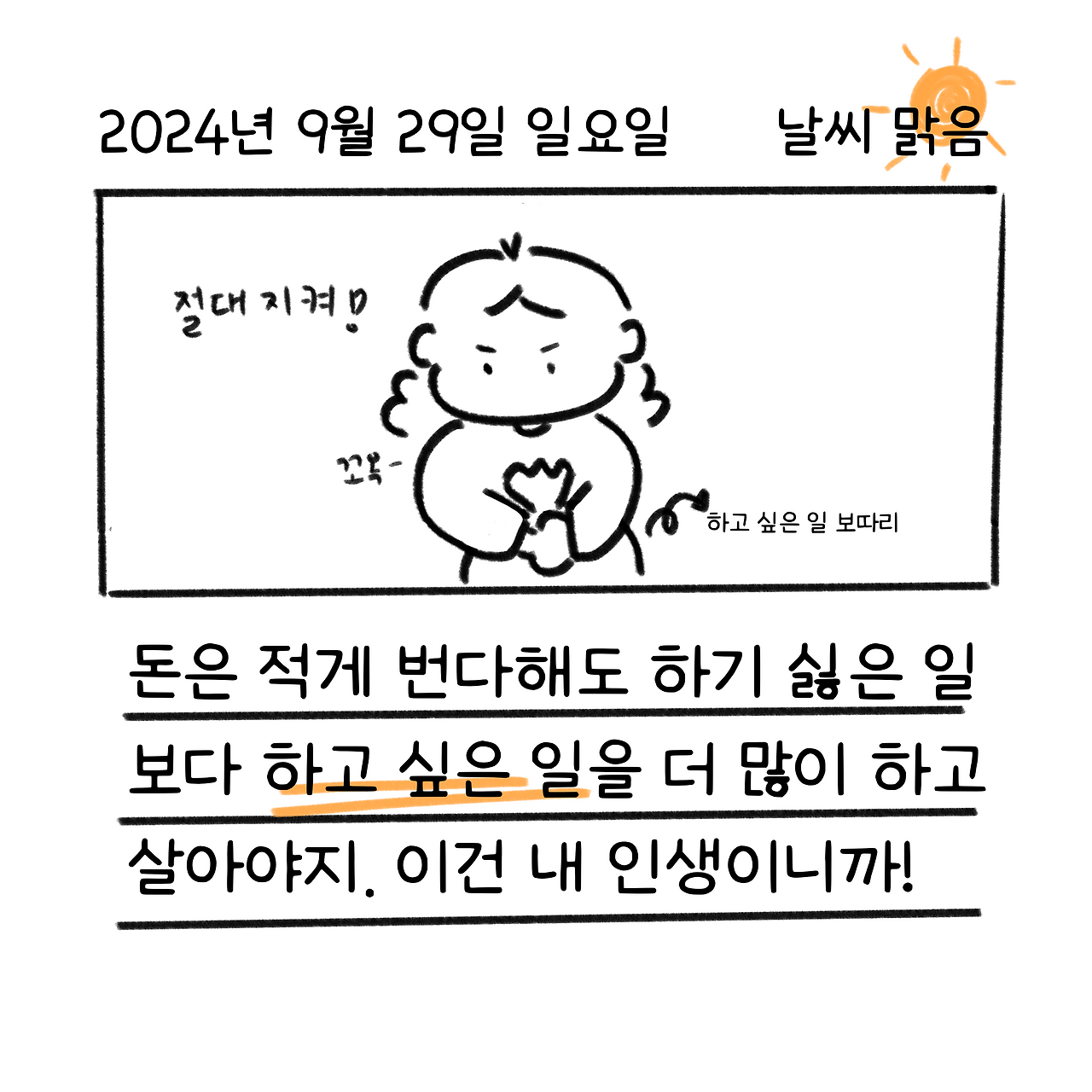 제 삶의 목표를 한 문장으로 나타내보자면 '하고 싶은 일을 다른 일보다 더 많이 하며 사는 것'이에요. 하고 싶은 일보다 하고 싶지 않은 일을 더 많이 해야만 했던 시절, 이것이 과연 내 인생이라 말할 수 있을까 의심이 들더라고요. 그렇기에 '하고 싶은 일'만큼은 삶에서 절대 빼앗기고 싶지 않아요.