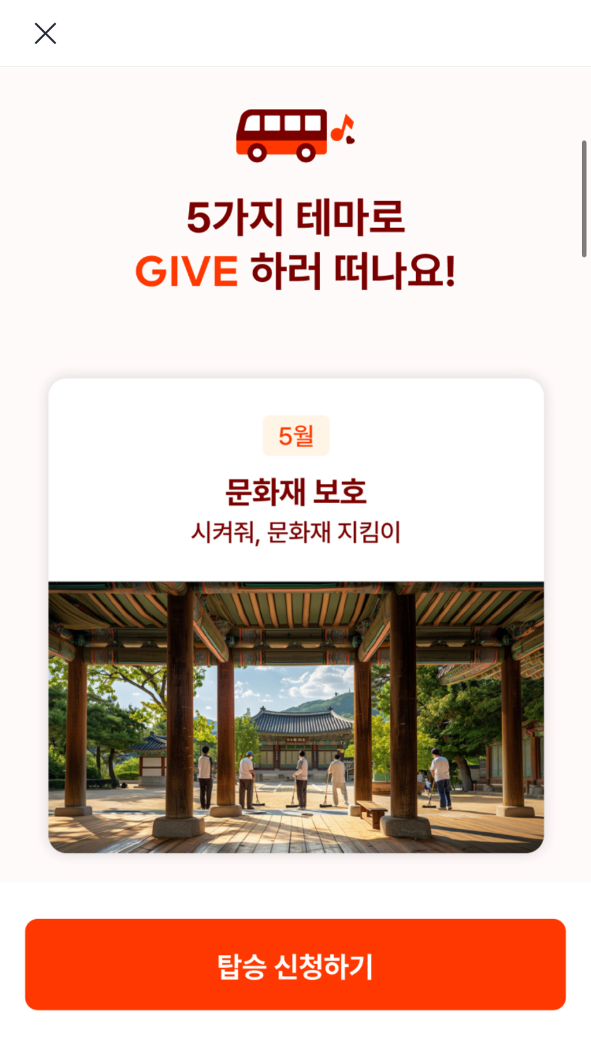 기브셔틀 프로그램은 5월~10월까지(8월 제외) 매달 △문화재 보호 △생태종 보호 △사회적 기업 탐방 △농촌지역 돕기 △유기동물 지원 등 5개 봉사테마로 운영되는데요.