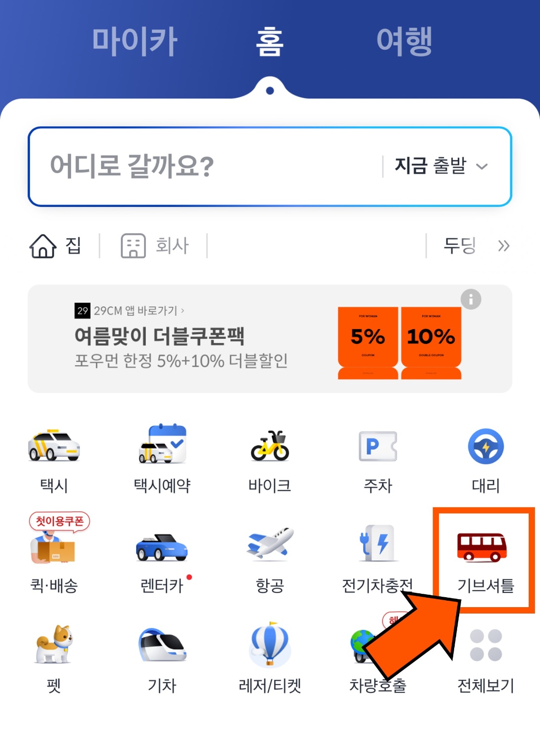 기브셔틀 일정에 대한 상세한 정보는 카카오 T 앱 메인화면과 여행탭에 위치한 '기브셔틀' 항목을 통해 확인할 수 있는데요. 제가 직접 들어가서 확인했는데, 바로 보이는 위치라 너무 편하더라고요! 😊