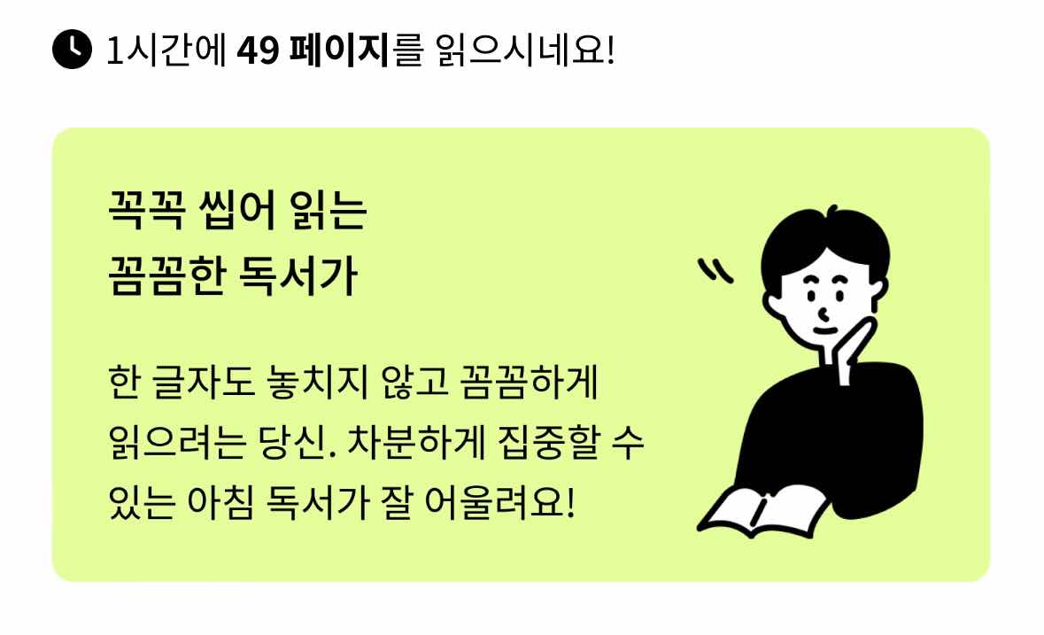 이렇게 각자 독서를 완결할 수 있게 시간개념을 넣어 추천해주니 신선해요 🤠