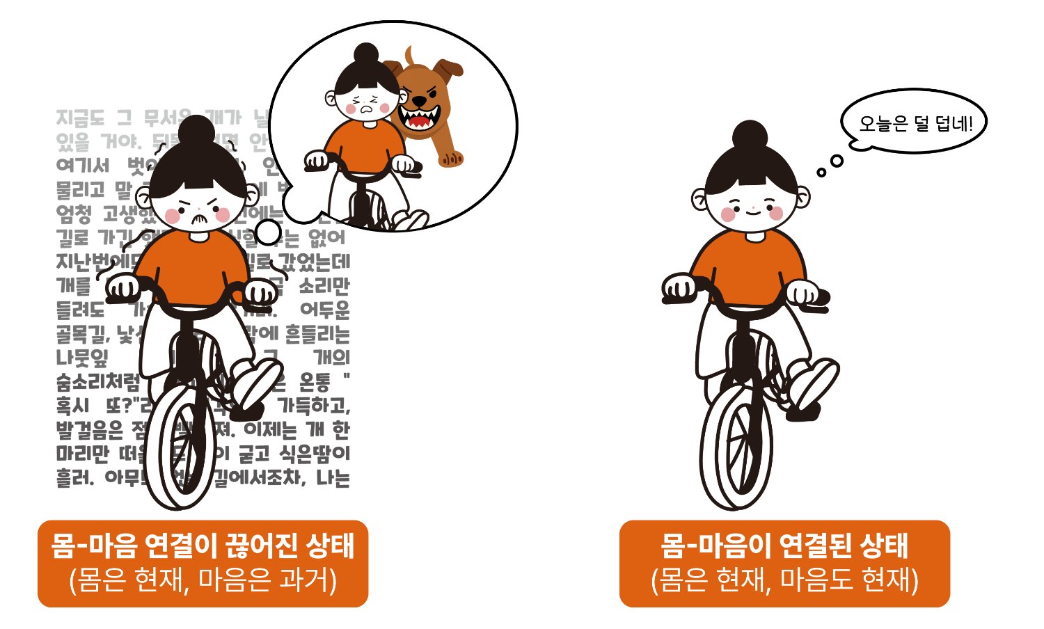 반면 몸은 언제나 지금, 여기 현실 속에 머물러요. 악몽을 꿀 때, 우리 뇌는 꿈 속에 있지만 몸은 이불 속에 있다는 걸 떠올리면 쉬워요. 몸이 현재에 있듯 마음도 몸과 함께 ‘지금 여기’ 에 존재하면 좋겠지만, 마음은 언제든지 과거와 미래를 드나들 수 있기에, 자주 몸과의 연결이 끊어질 수 있답니다. 그래서 과거의 트라우마 속 장면으로 빨려 들어간 마음을 다시 현실과 빨리 이어지게 만들면 그때의 공포반응이 재생되는 것을 쉽게 멈출 수 있어요.