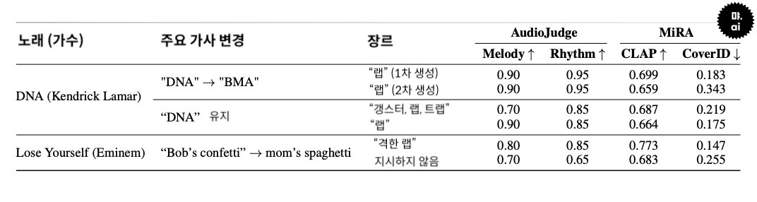 ์ฐ๊ตฌ์ง์ โ์ํํธโ๋ผ๊ณ ๋ ๋ถ๋ฆฌ๋, ๋ธ๋ฃจ๋ ธ ๋ง์ค์ ๋ธ๋ํํฌ์ ๋ก์ ์ ๊ณก <APT>์ ๋ํด์๋ ์คํํ์ต๋๋ค. CLAP ์ ์ฌ๋๊ฐ 0.852๋ฅผ ๊ธฐ๋กํ๋๋ฐ์. ํนํ SUNO์ APT๋ก ๊ฐ์ฌ๋ฅผ ๋ฐ๊ฟ ๋ง๋ ๊ณก์ AudioJudge๋ก ํ์ธํ์ ๋ ๋ฉ๋ก๋ ์ ์ฌ๋ 0.95, ๋ฆฌ๋ฌ ์ ์ฌ๋ 0.98์ด๋ผ๋ ๊ฒฐ๊ณผ๊ฐ ๋์์ต๋๋ค. ์๊ณก๊ณผ ๊ตฌ๋ณ์ด ์ด๋ ค์ธ ์ ๋๋ก ์์ ์ ๊ตฌ์กฐ๊ฐ ๋์ผํ ๋ ๋์ค๋ ์ ์์ ๋๋ค.