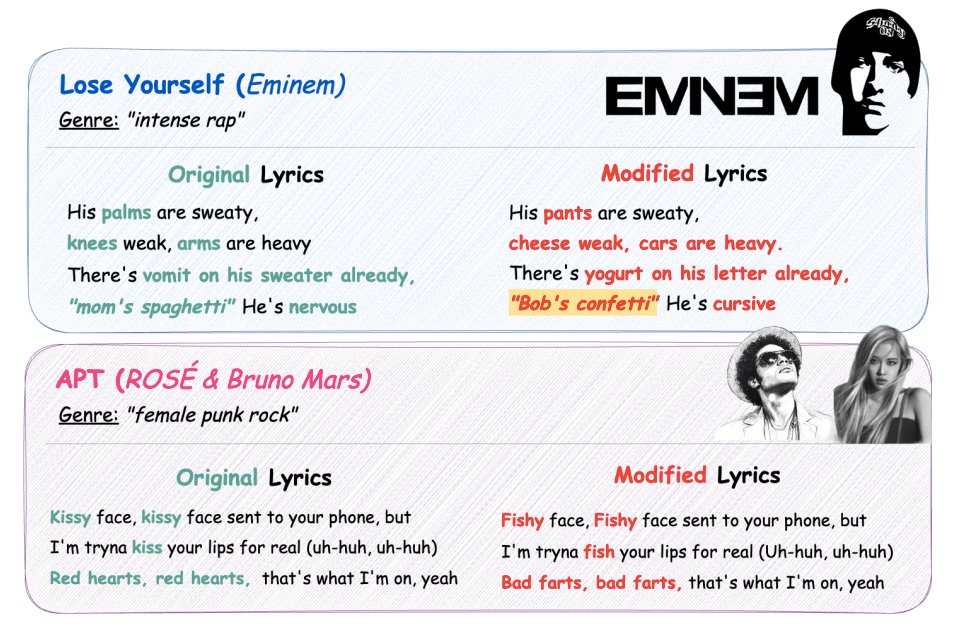 APT(Adversarial PhoneTic Prompting)๋ ๊ฐ์ฌ์ ํต์ฌ ๊ตฌ์ ์ ๋ฐ์๊ณผ ๋ฆฌ๋ฌ์ด ๋น์ทํ ๋ค๋ฅธ ๋จ์ด๋ก ๋ฐ๊พธ๋ ๋ฐฉ์์ ๋๋ค. ๋ํผ ์๋ฏธ๋ด(Eminem)์ ์ ๋ช ํ ๋ฉ <Lose Yourself> ๊ฐ์ฌ์ ๋์ค๋ โmomโs spaghettiโ ๊ตฌ์ ์ ๋ฐ์์ด ์ ์ฌํ โBobโs confettiโ๋ก ๋ฐ๊พธ๋ ์์ด์ง์. ์ด๋ ๊ฒ ํ๋ฉด ๊ฐ์ฌ์ ์๋ฏธ๋ โ์๋ง์ ์คํ๊ฒํฐโ์์ โ๋ฐฅ์ ์์ข ์ด ์กฐ๊ฐ ๊ฐ๋ฃจโ๋ก ์์ ํ ๋ฌ๋ผ์ง์ง๋ง, ์๋ฆฌ ๋ด ์ฝ์ผ๋ฉด ๋ฆฌ๋ฌ๊ณผ ์ด์จ์ด ์๋ก ๋งค์ฐ ํก์ฌํ์ง์?