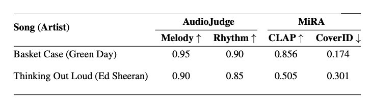 AudioJudge: GPT-4 ๊ธฐ๋ฐ์ผ๋ก ์์ ๋ ๊ฐ์ ๋ฉ๋ก๋ ์ ์ฌ๋์ ๋ฆฌ๋ฌ ์ ์ฌ๋๋ฅผ 0~1 ์ฌ์ด๋ก ํ๊ฐํด ์ฃผ๋ ์์คํ ์ผ๋ก, CLAP๊ณผ ๋ง์ฐฌ๊ฐ์ง๋ก 1์ ๊ฐ๊น์ธ์๋ก ์ ์ฌํจ์ ์๋ฏธํ๋ค.