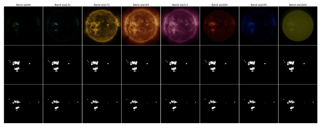 Surya๊ฐ ์๋ณธ SDO ์์(์์ค)์ ๋ณด๊ณ , ํ๋ ์์ญ์ ์๋์ผ๋ก ๋ถ๋ฆฌ(๊ฐ์ด๋ฐ ์ค)ํ๋๋ฐ, ๊ทธ ๊ฒฐ๊ณผ๊ฐ ์ค์ ์ ๋ต(์๋ซ์ค)๊ณผ ์ผ๋ง๋ ์ผ์นํ๋์ง๋ฅผ ์๊ฐ์ ์ผ๋ก ๋น๊ตํ๋ ๊ทธ๋ฆผ์ ๋๋ค. ํ๋ ์์ญ์ ํ๋ ์ด์ ๊ฐ์ ํญ๋ฐ์ด ์์๋๋ ๋ฐํ ์ง์ ์ธ๋ฐ์. ์ด๋ฐ ์ํ ์ง์ญ์ ์ ์ก์๋ด์ผ ์ฐ์ฃผ ๋ ์จ๋ฅผ ์ ํํ๊ฒ ์์ธกํ๊ณ ํ์ฉํ ์ ์๊ฒ ์ง์?