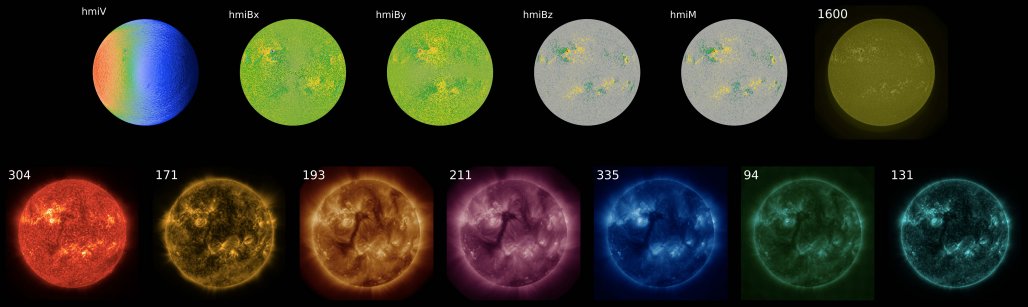 SDO ํ์ ์์ ์์. ์ ์ค ๋ค์ฏ ๊ฐ๋ AIA ๋ฐ์ดํฐ๋ฅผ, ์์ค ๋งจ ์ค๋ฅธ์ชฝ(1600)๋ถํฐ ์๋ซ์ค์ HMI ๋ฐ์ดํฐ๋ฅผ ๋ํ๋ธ๋ค. ์ถ์ฒ: ๋ ผ๋ฌธ