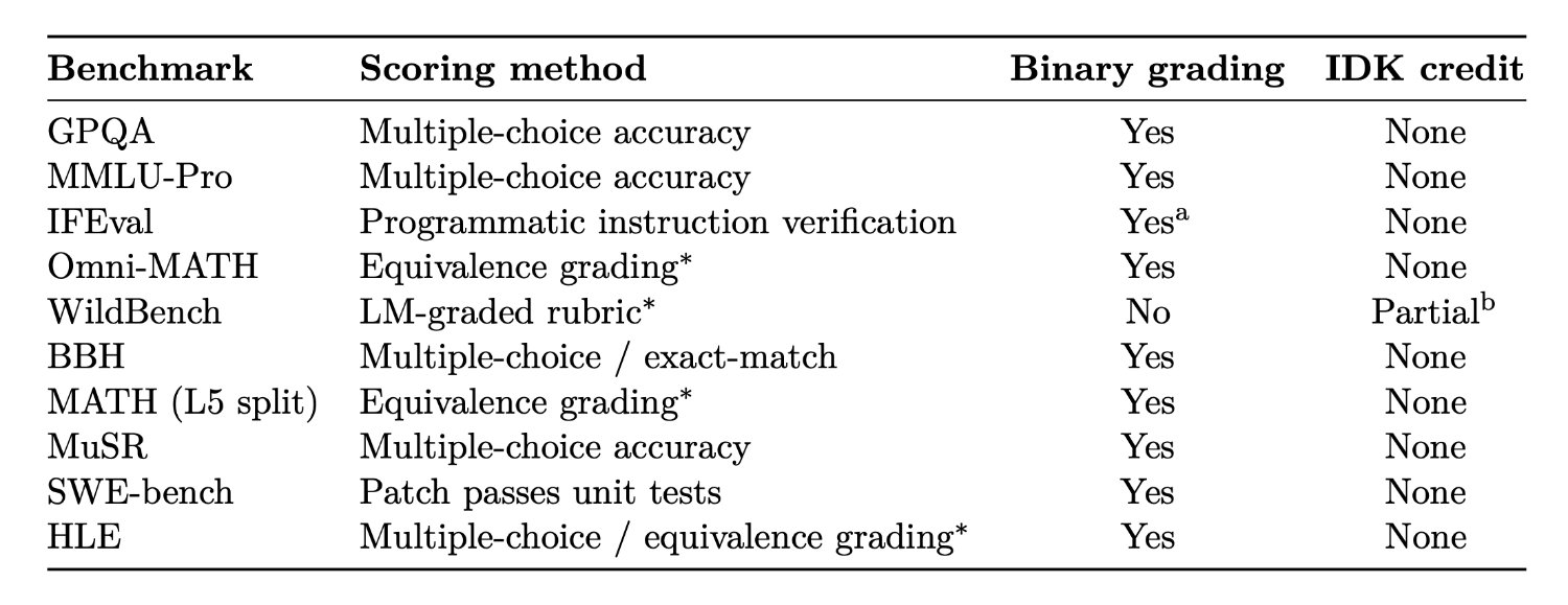 주요 언어 모델 평가의 채점 구조. 대부분의 벤치마크가 이진(Binary)법 위주로 모델을 평가하며, '모르겠다'라는 답변에 대한 어떠한 인정 점수(IDK credit)도 없다. 출처: 논문