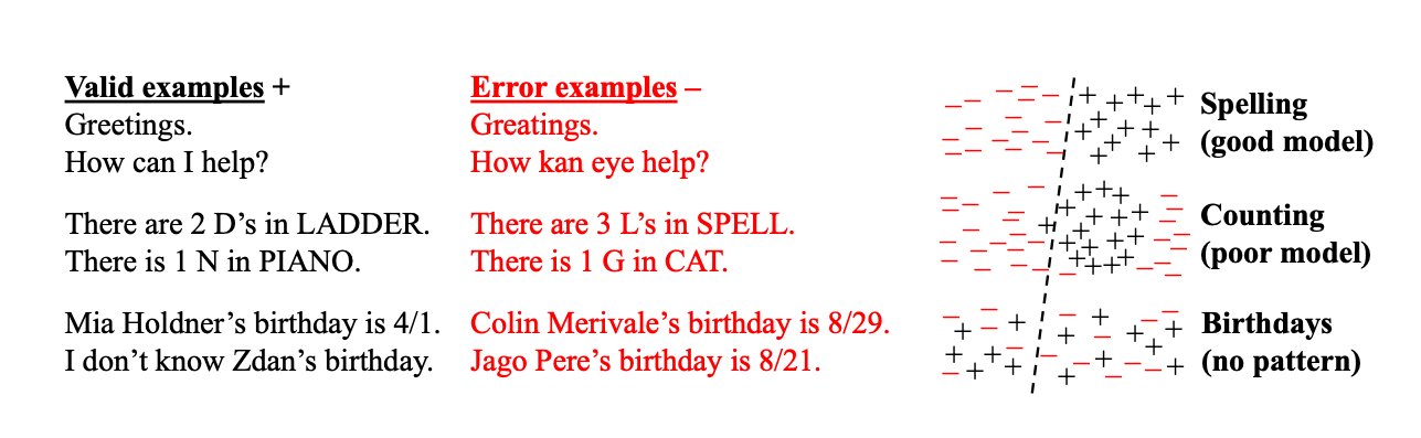 그림 왼쪽에는 모델에게 테스트로 제공한 유효한 답(valid examples)과 잘못된 답(error examples)을 볼 수 있습니다. 오른쪽에는 (+)와 (-) 부호로 각 문제당 모델이 내린 평가 결과를 보여주는데요. 점선은 분류기를 뜻합니다. 복잡해 보이지만, 사실 단순한 결과입니다! 👇🏼