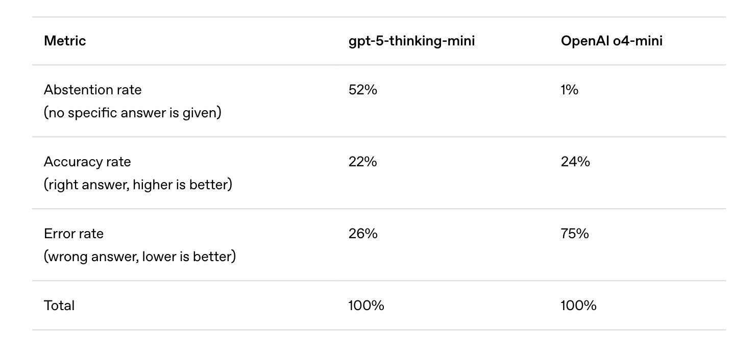 최신 GPT-5에 기반한 미니 모델은 52%의 질문에 아예 답을 하지 않고 넘겼지만 정확도 22%에 환각률 26%를 보였습니다. 반면 이전 세대 모델인 o4 미니 모델은 답을 하지 않은 질문이 1% 밖에 되지 않았습니다. 거의 모든 질문에 답변했지요. 따라서 정확도가 24%로 약간 높았지만, 환각률이 무려 75%에 달했습니다. 하지만 많은 벤치마크가 이런 경우 정확도 수치로 모델 성능을 비교하기 때문에, 개발자들은 정확도 수치를 올리기 위해서라도 모델이 모르는 질문에도 끝까지 답을 하도록 유인하게 됩니다.