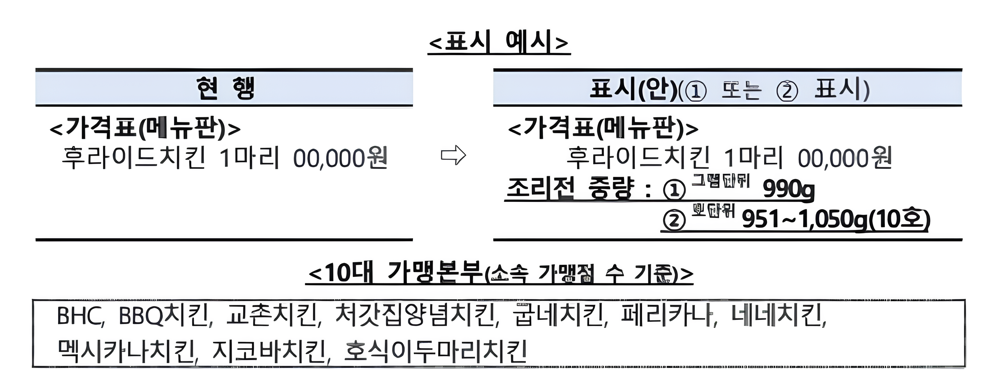 정부가 치킨 업계에 ‘조리 전 중량 표시제’를 도입하기로 결정했어요. 10대 치킨 프랜차이즈는 오는 15일부터 메뉴판 등에서 조리 전 중량을 명확히 알려야 하는데요. 메뉴판에 적힌 치킨 가격 옆에 조리 전 총 중량을 그램(g)이나 호(생닭 크기) 단위로 표시하는 방식이에요 🍗🧾. 배달 앱 등 온라인 주문에도 적용되고요. 중량을 줄여 사실상 가격을 올릴 경우에도 “치킨 중량이 600g → 550g으로 조정돼 g당 가격이 일부 인상됐습니다”는 식으로 소비자들에게 알려야 해요.
