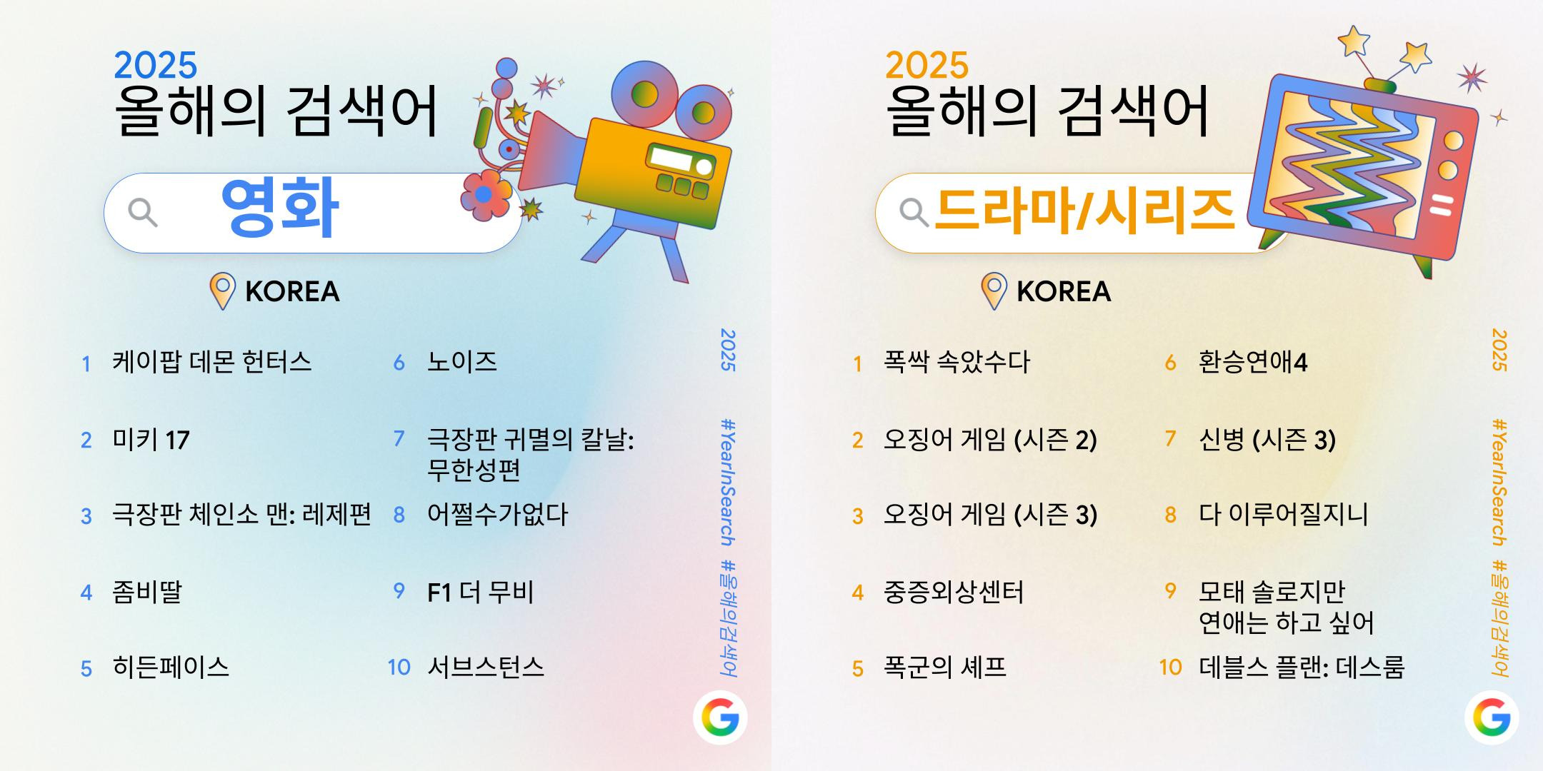 영화 부문에서는 전 세계적인 인기를 모은 ‘케이팝 데몬 헌터스’는 물론, 봉준호 감독의 ‘미키 17’, 박찬욱 감독의 ‘어쩔수가없다’ 등 국내외에서 기대를 모았던 작품들이 검색 상위권을 이끌었고요 🎞️. 국내 박스오피스 1위를 차지한 ‘귀멸의 칼날’, 인기와 화제성을 동시에 잡았던 ‘좀비딸’과 ‘F1 더 무비’, 칸 영화제 각본상을 수상한 ‘서브스턴스’ 등의 작품도 순위에 올랐어요. 드라마·시리즈에서는 ‘폭싹 속았수다’, ‘폭군의 셰프’, ‘환승연애 4’, ‘모태솔로지만 연애는 하고 싶어’ 등 정서적 공감과 새로운 형식을 결합한 콘텐츠가 넓은 관심을 받았어요 🥰.