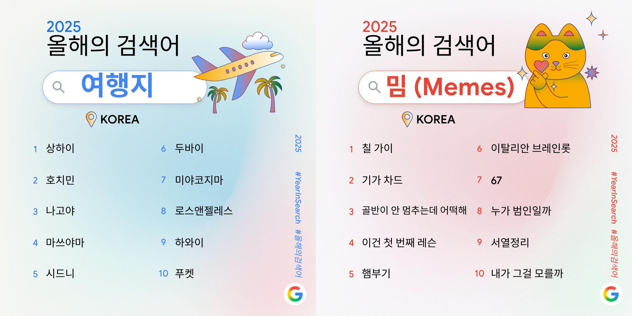- 크리에이터 타일러 라쉬는: “한국의 검색어를 보면 ‘극현실 생존법’과 ‘확실한 도파민’이 나란히 보이는 게 인상적”이라고 밝혔는데요. “겉으로는 모순처럼 보이지만, 개인적으로 굉장히 ‘한국스러운 스마트한 에너지 배분’이라고 느낀다”고 전했어요. “현실은 똑똑하게 버티고, 즐거움은 확실하게 챙긴 덕분에 한국은 올해도 지루할 틈 없이 뜨거운 한 해를 보낸 것 같다 😀”고 덧붙였고요.