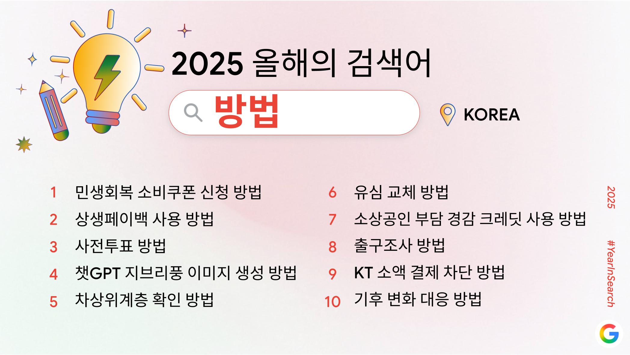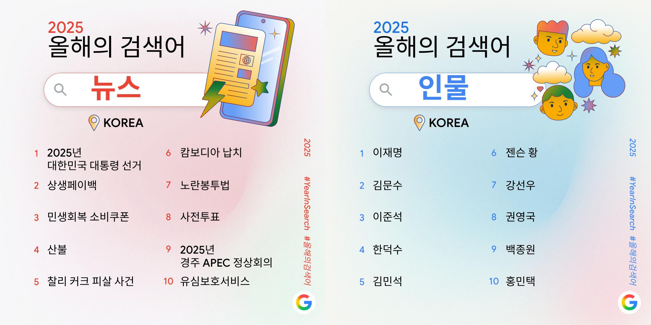 - ‘올해의 검색어’가 뭐야? 🔍: 한 해 동안 구글에서 지난해 대비 검색량이 급격히 증가한 단어를 기반으로 이용자들의 관심 변화를 보여주는 연례 데이터 리포트예요. 절대 검색량이 아닌 ‘지난해 대비 증가 폭’을 기준으로 집계되기 때문에, 2025년 한국 사회에서 어떤 주제가 빠르게 주목받았는지를 확인할 수 있어요.